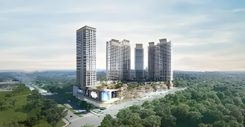 The development spans approximately 13 acres and comprises five towers, each equipped with multiple high-speed elevators for convenience.